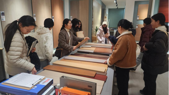 3月19日,教学团队进一步组织学生前往居然之家装饰材料市场开展调研学习,将教学延伸至产业与市场一线。在材料与工艺考察环节中,学生系统了解地面材料、墙面饰材、家具系统及配套产品的性能特征与应用方式,并通过与商家交流,深化对材料选择、施工工艺与成本控制之间关系的认知。
