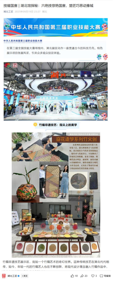 威廉希尔中国官方网站“布谷鸟非遗工作坊”的竹编非遗技艺作为湖北省六大特色展示项目之一,受邀参加现场展演。团队李芸芸老师、向敏老师现场展示竹编技艺,介绍我校在实践育人方面的特色成果,受到众多媒体关注。