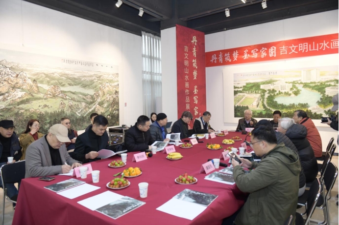 开幕式后同期举办了“丹青筑梦 墨写家园——吉文明山水画作品展”学术研讨会,孙克担任学术主持。张复兴、陈池瑜、王志纯、高天民、曹建华、张桐瑀、李向阳、王赫赫、谭国亮、徐义平、任军伟、臧家伟等理论家和艺术家参加研讨。与会专家高度认可吉文明扎实的笔墨功底、纯粹的创作态度与鲜明的探索意识,认为其作品在传统与现代的平衡中彰显独特艺术价值,并就其未来创作方向提出建议。
