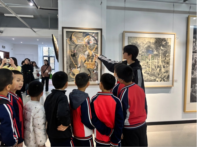 全程陪伴的志愿者们,与孩子们并肩驻足、耐心交流。他们解读水墨的韵味肌理,探讨雕塑的造型巧思,回应着孩子们接连不断的 “十万个为什么”。温柔的讲解与热烈的提问交织,让这场研学之旅不仅有艺术的熏陶,更有青春同伴的专属温度,实现了 “润物细无声” 的育人效果。